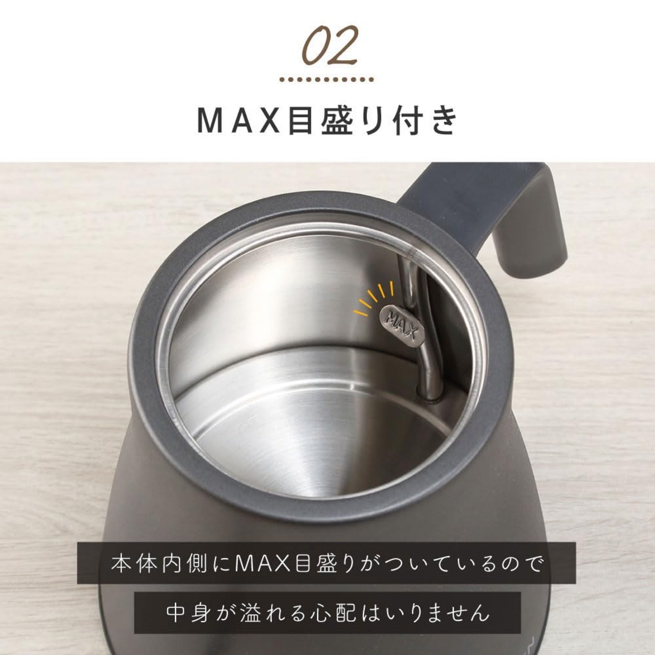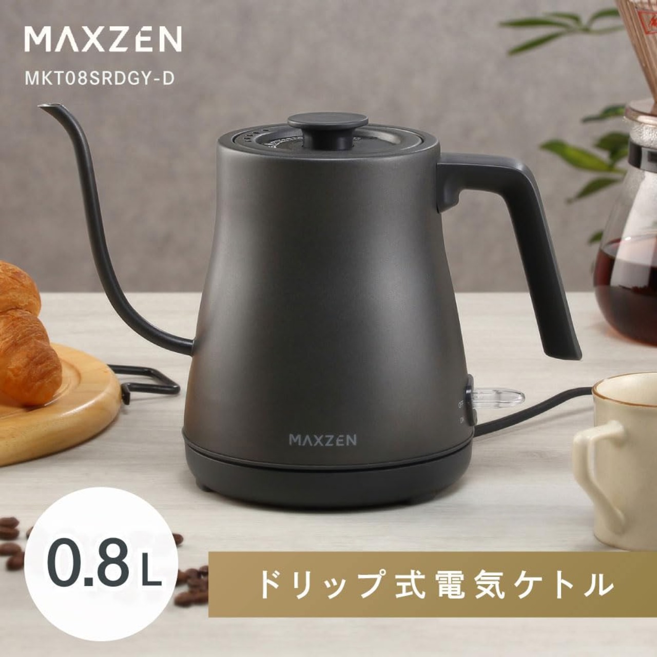 MAXZEN 電気ケトル ケトル 大容量 0.8L ドリップ 空だき防止 簡単操作 ワンタッチ 細口ノズル コンパクト 800ml ダークグレー MKT08SRDGY-D マクスゼン