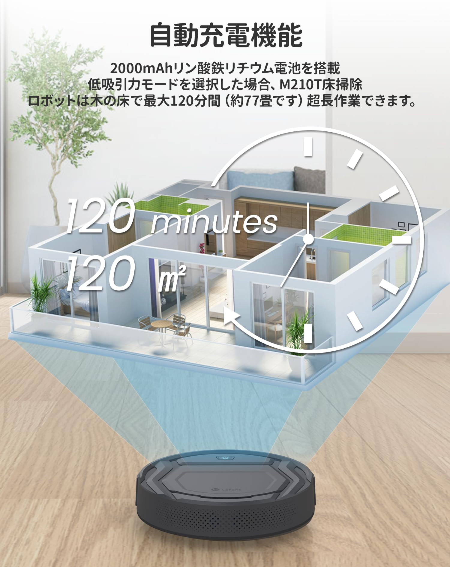 ロボット掃除機 【お掃除ロボット 2200pa強力吸引 カーペット加圧 音量調節 低騒音 予約清掃 自動充電 Wi-Fi対応BoostIQ搭載 120分間連続稼働 落下 衝突防止 水タンクなしでモップ掛け可能】自動掃除機 Lefant M210P グレー